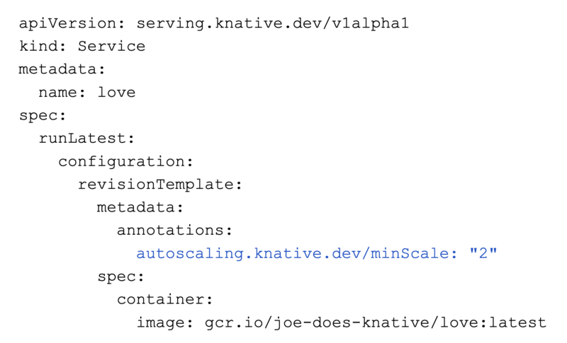 Several weeks later, lightning strikes again and you realize… “I could make money doing this”. Clearly people enjoyed the heart-shaped watermarks. Maybe you could let people use your service to watermark images on their entire website! Adding a quick in-memory cache in front of your Ruby script (yeah, it’s Ruby) you redeploy and then start advertising your product as a general image-processing service. Things are going well, but you quickly realize that your traffic is unpredictable — it bursts a lot. And when the service scales to 0 Pods and later the traffic resumes, you spend the first few minutes building up the cache again, which makes request latency a little too high. So you decide to add an annotation to your Knative Service’s Revision template to maintain at least 2 Pods at all times.