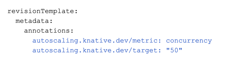 But eventually you conclude that you just need to scale on CPU to keep your machines hot. So you choose a different Knative autoscaling class entirely. The class annotation will tell Knative to use a different PodAutoscaler controller implementation, kinda like Kubernetes Ingress.